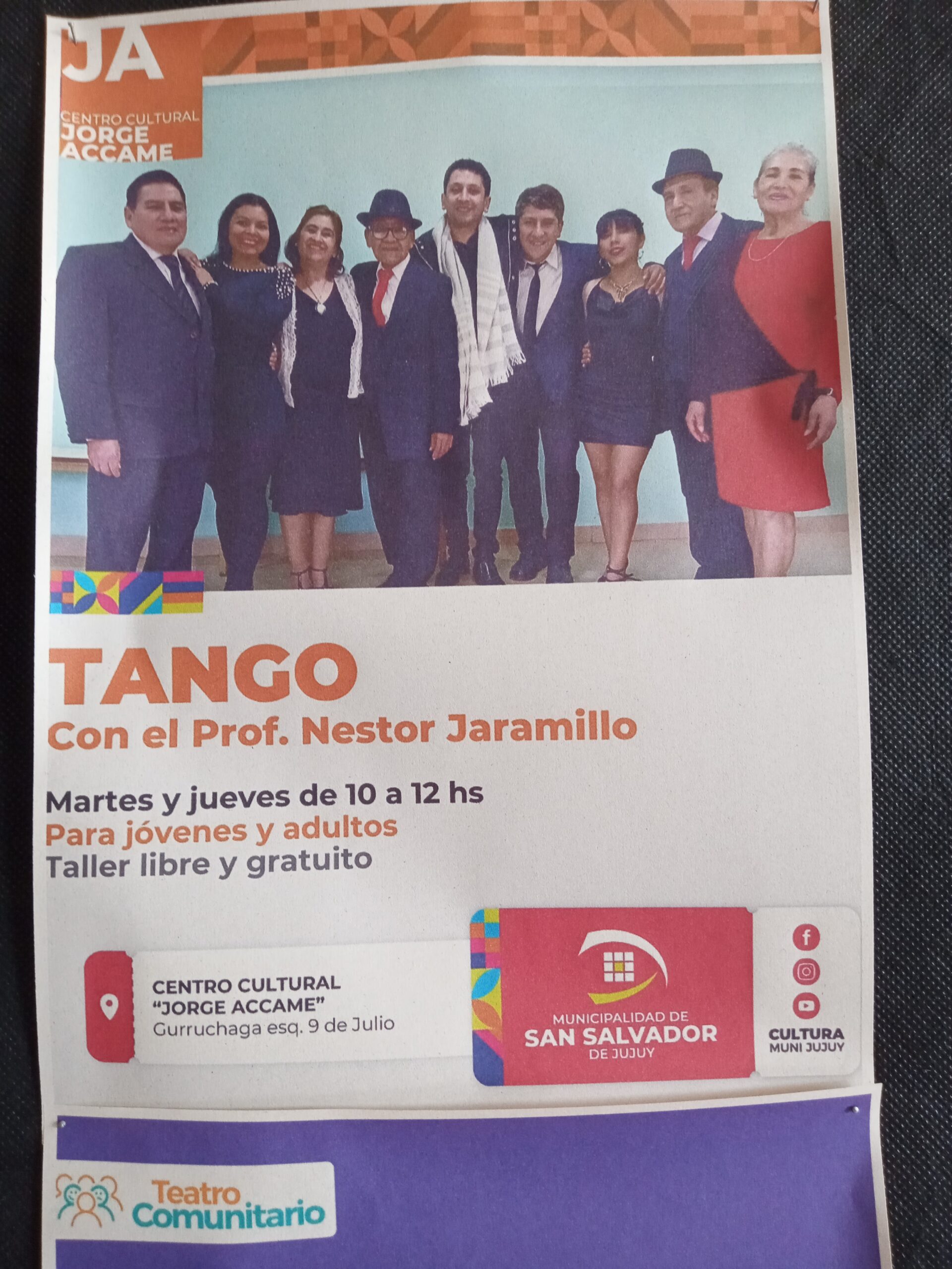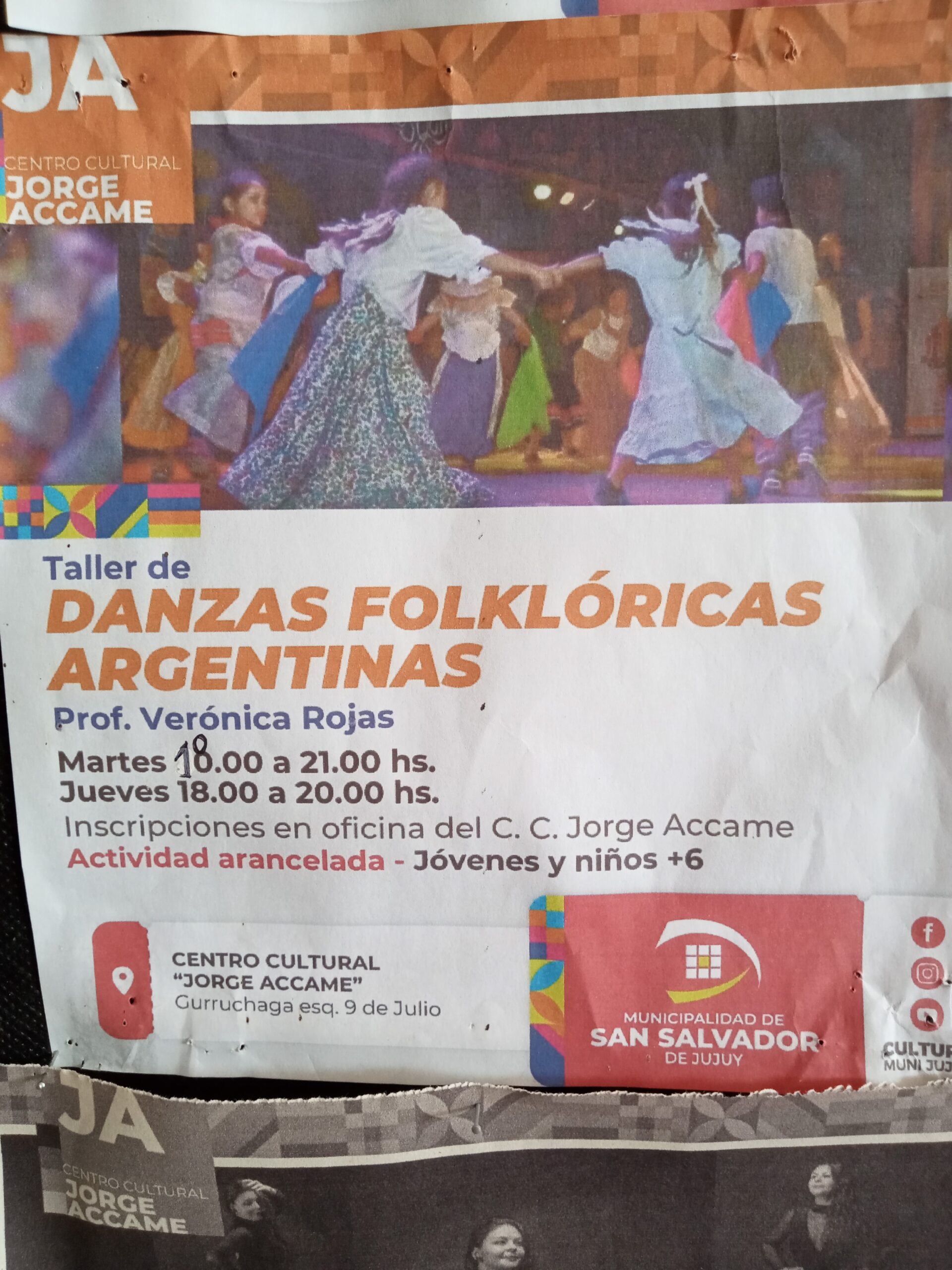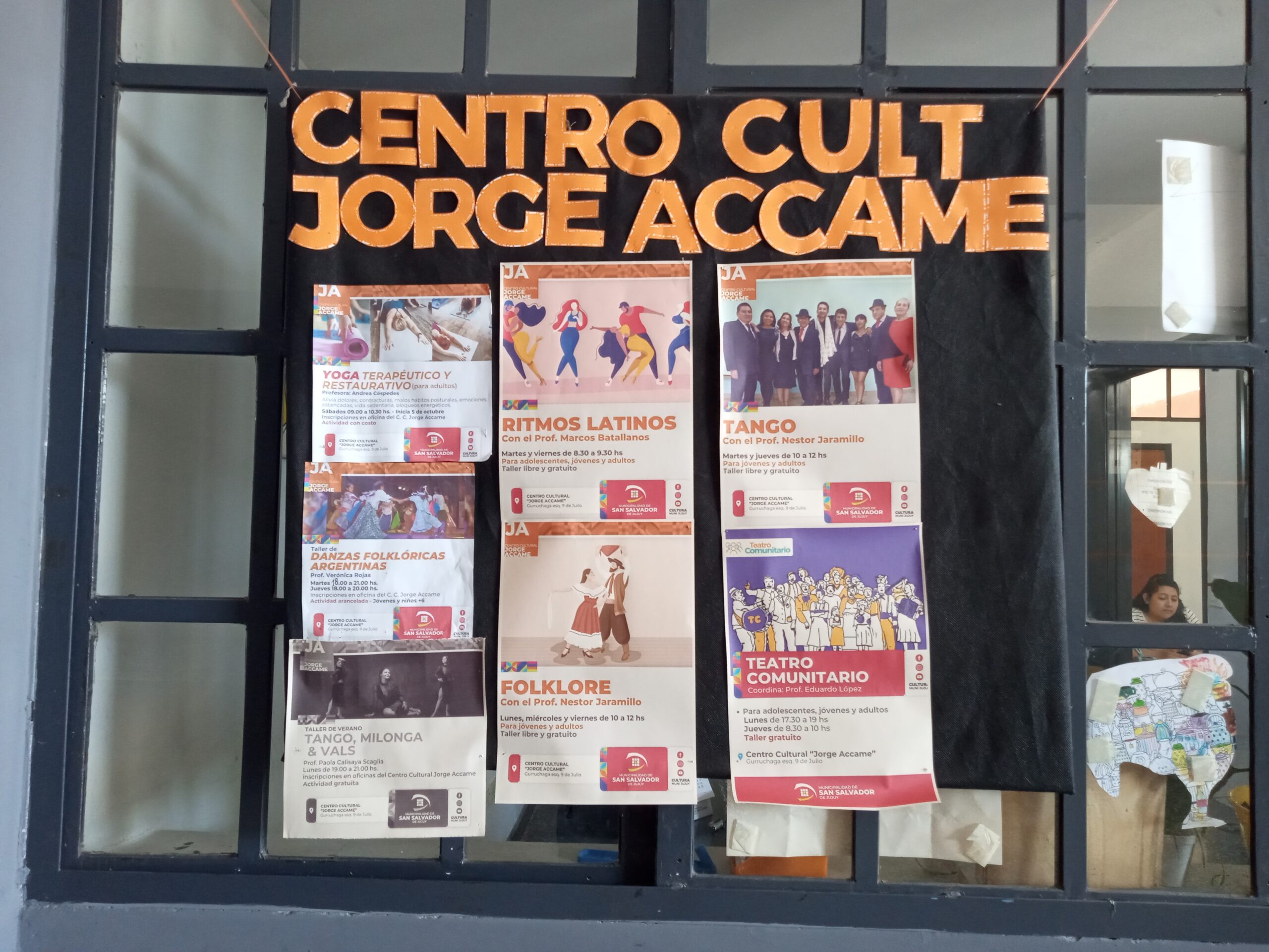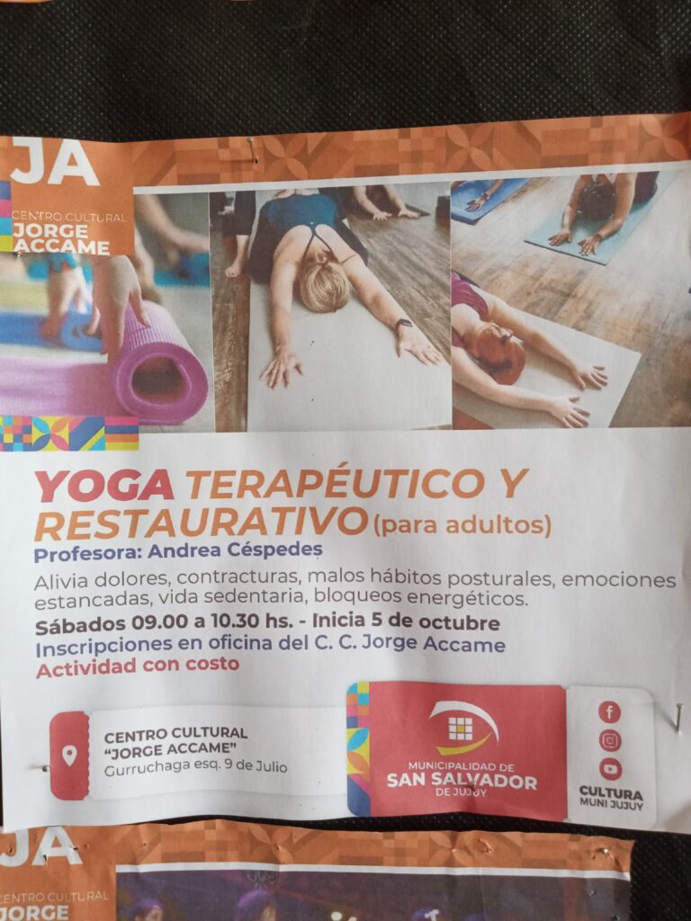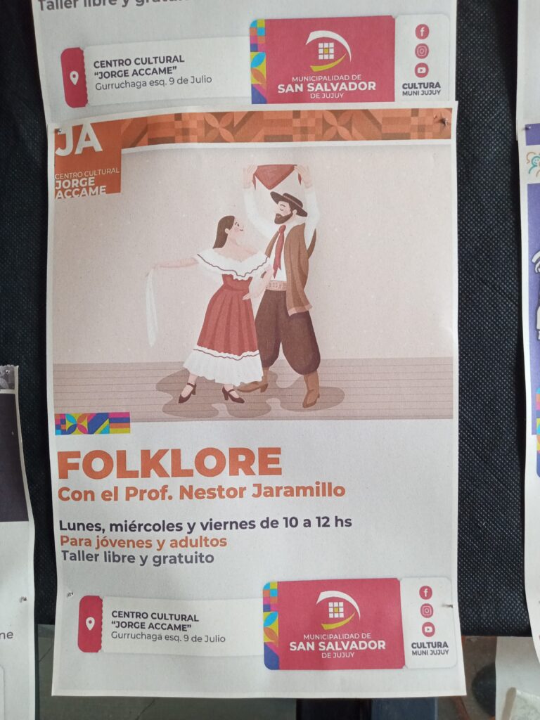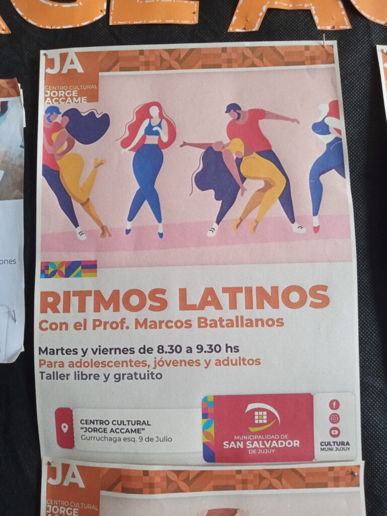 Centro Cultural Jorge Accame , ofrece cursos de Yoga, Folklore, Tango y mucho más. Aya 6 marzo, 2025 0 Educación El Centro Cultural se encuentra en la calle Gurruchaga N 25 y 9 de Julio,Barrio 12 de Octubre,San Salvador de Jujuy . Las inscripciones están abiertas y algunas son gratuitas. Para niños, jóvenes y adultos. Comparte esto:Entrada Haz clic para enviar un enlace por correo electrónico a un amigo (Se abre en una ventana nueva) Correo electrónico Haz clic para compartir en Telegram (Se abre en una ventana nueva) Telegram Haz clic para compartir en WhatsApp (Se abre en una ventana nueva) WhatsApp Centro cultural Jorge AccameFolkloreRitmos caribeñosTangoTeatro comunitarioYoga