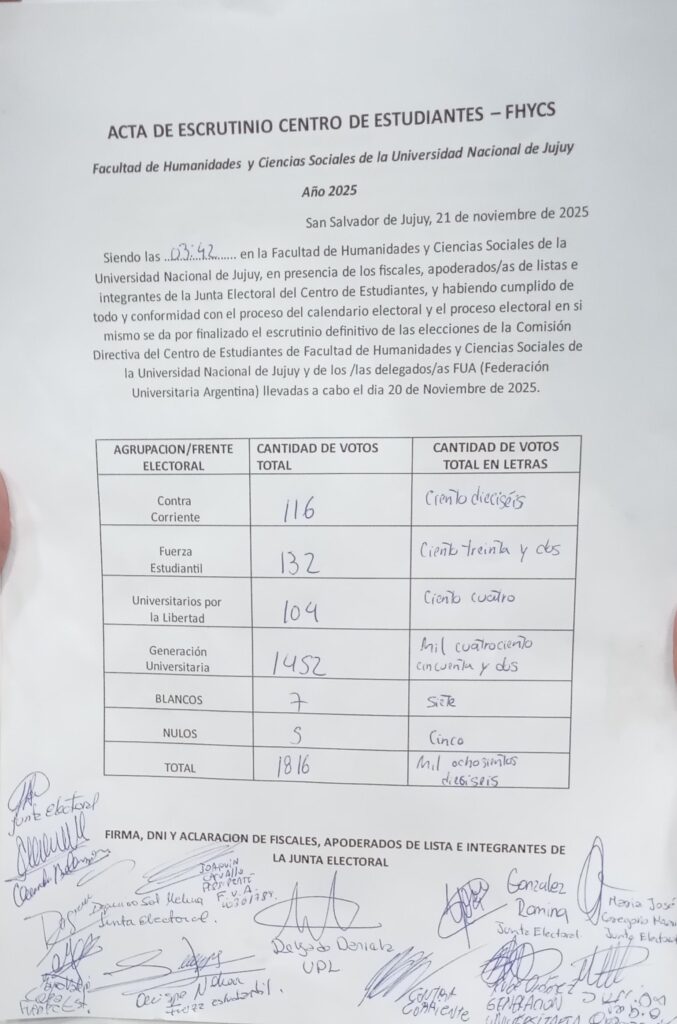 La elección del Centro de Estudiantes de la Facultad de Humanidades y Ciencias Sociales (UNJu) del pasado 20 de noviembre dejó mucho más que números. Dejó señales políticas, sociales y culturales en un contexto provincial donde operan distintas fake news, bajadas de línea y discursos de odio dirigidos contra sectores específicos, en este caso, la comunidad universitaria. Lo que pasó en la FHyCS no puede separarse de ese clima: una disputa por los sentidos, por la representación y por el lugar de la política en los espacios públicos.