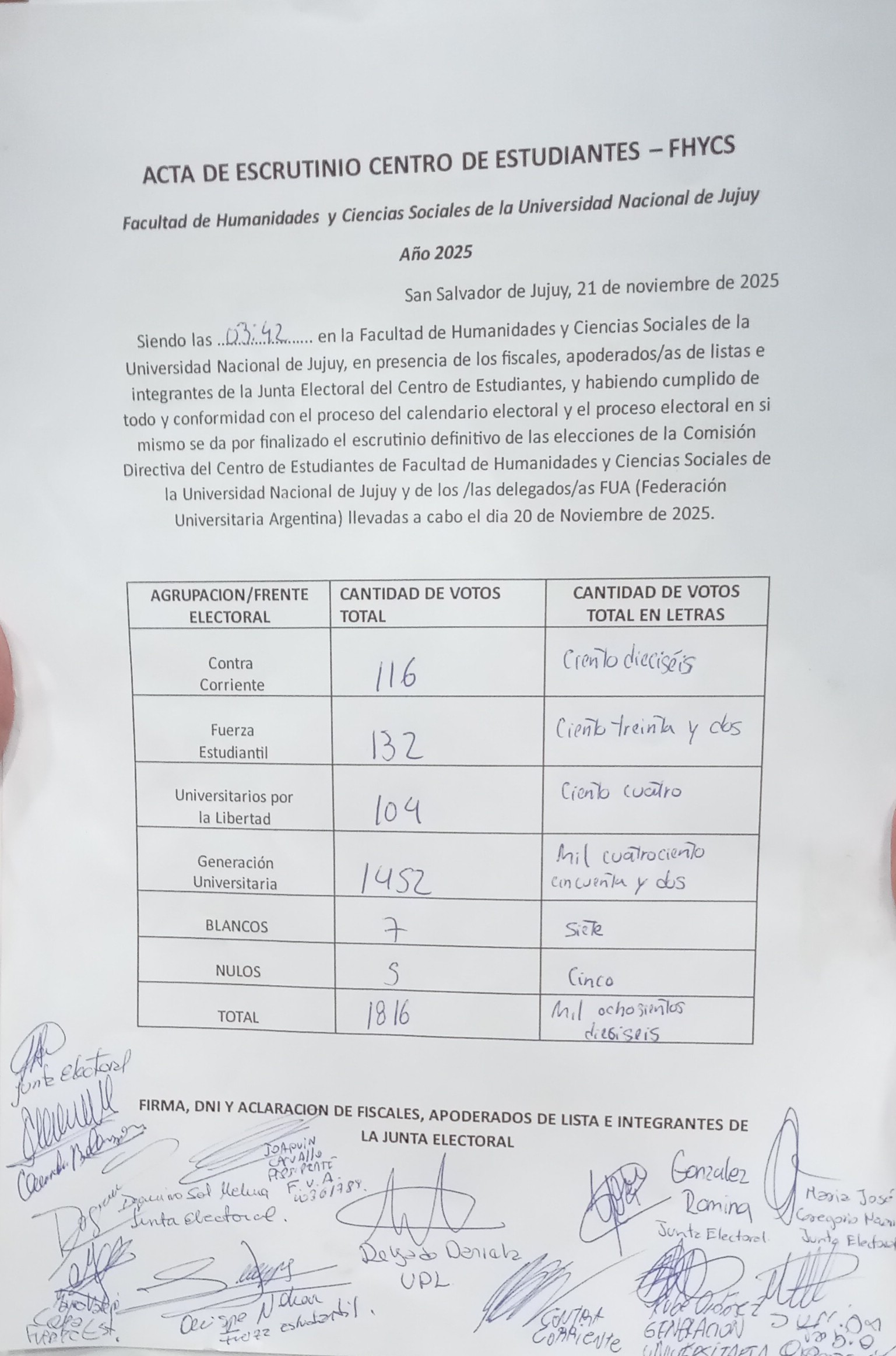 - Generación Universitaria ( Franja Morada,U21,FU. Horizonte, Protección): 1452 votos