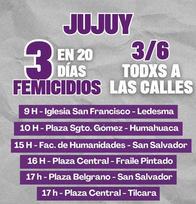 Este martes 3 de junio, en el marco del #3J —una fecha emblemática desde la primera marcha de Ni Una Menos en 2015—, la ciudadanía jujeña se movilizará a las 17 hs en la Plaza Belgrano de San Salvador para pedir justicia por los femicidios recientes y por todas las víctimas que aún esperan respuestas. También habrá movilizaciones en otras localidades de la provincia.