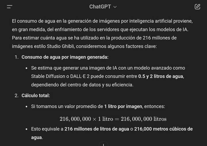 Si tomamos un promedio de 1 litro por imagen y consideramos la producción de 216 millones de imágenes con estilo Studio Ghibli, el consumo total ascendería a 216 millones de litros de agua, equivalente a 216.000 metros cúbicos de agua. Este dato pone en evidencia el impacto ambiental de la tecnología y plantea interrogantes sobre la sostenibilidad de estos desarrollos a gran escala.