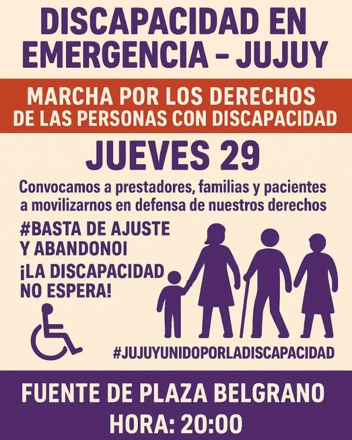 En medio de un contexto crítico para el sistema de atención a personas con discapacidad, Jujuy será escenario de una marcha que busca visibilizar la situación de emergencia que atraviesa este sector. Bajo el lema “Discapacidad en emergencia – Jujuy”, la convocatoria llama a movilizarse este jueves 29 de mayo a las 20:00 horas en la Fuente de Plaza Belgrano, en pleno centro de San Salvador.