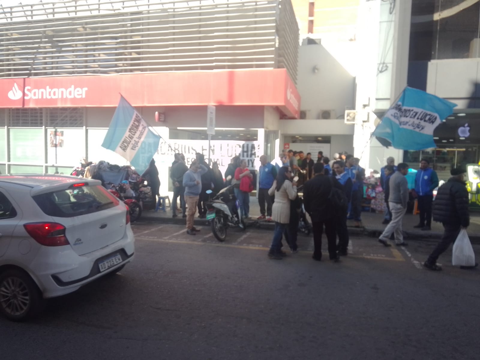 Este martes, trabajadores del Banco Santander Río acompañados por referentes del Sindicato La Bancaria se manifestaron de manera pacífica frente a la sucursal ubicada en las calles Alvear y Necochea, en pleno centro de la capital jujeña. La protesta forma parte de un plan de lucha a nivel nacional que incluye asambleas y movilizaciones escalonadas en distintas provincias del país.